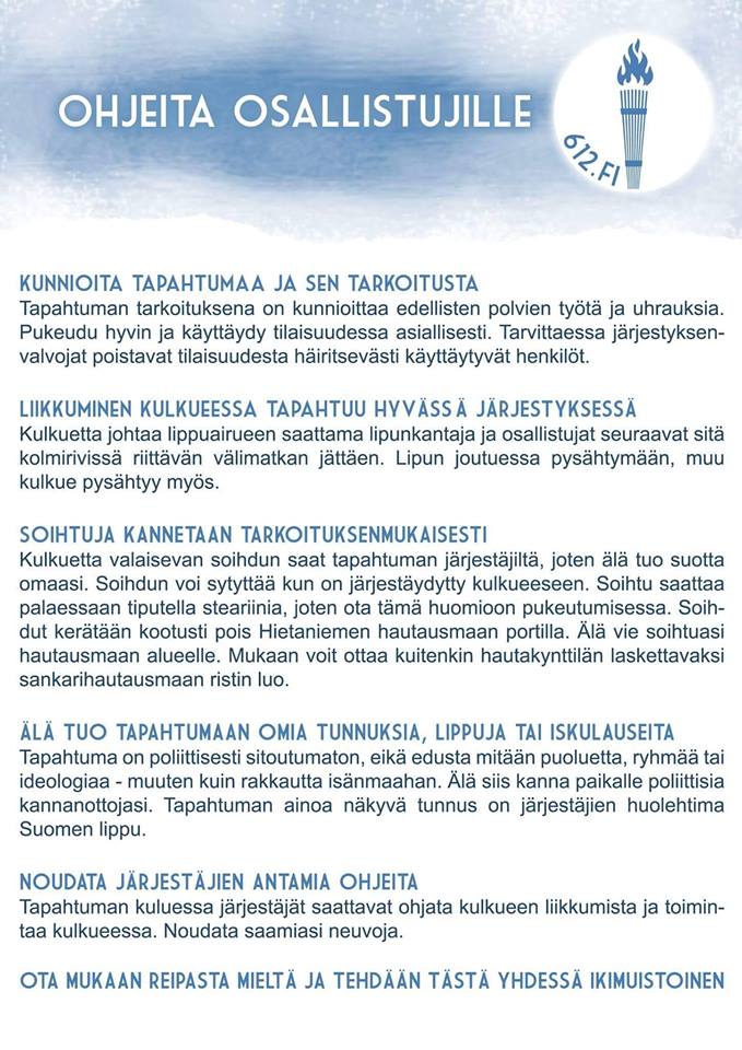 Tapahtuman ainoa tarkoitus on juhlistaa isänmaamme itsenäisyyttä ja kunnioittaa menneiden sukupolvien sen eteen tekemiä uhrauksia. Osallistujia kehotetaan kunnioittamaan tapahtuman luonnetta jättämällä kaikki poliittiset ja muut tunnukset kotiin. Yhteiskunnallinen eriarvoistuminen ja poliittinen polarisaatio on lyönyt kiilaa suomalaisten väliin jo aivan riittävästi; juuri epävarmoina aikoina pienen kansan suurin voimavara on yhtenäisyys.
